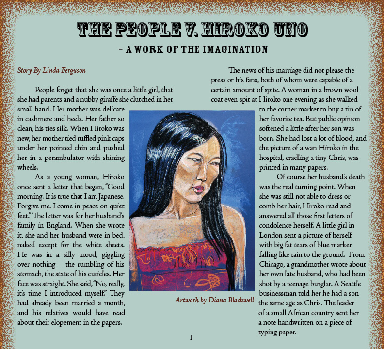 Diana Blackwell is a self-taught artist in Berkeley, California. She works in charcoal, acrylics, collage, block printing, and monoprinting. She belongs to the East Bay Figure Painters. Her work is a regular feature at Mignonne Décor in Berkeley. She has shown work all over the Bay Area and illustrated books and stories. Her online gallery is www.zhibit.org/diana_blackwell.