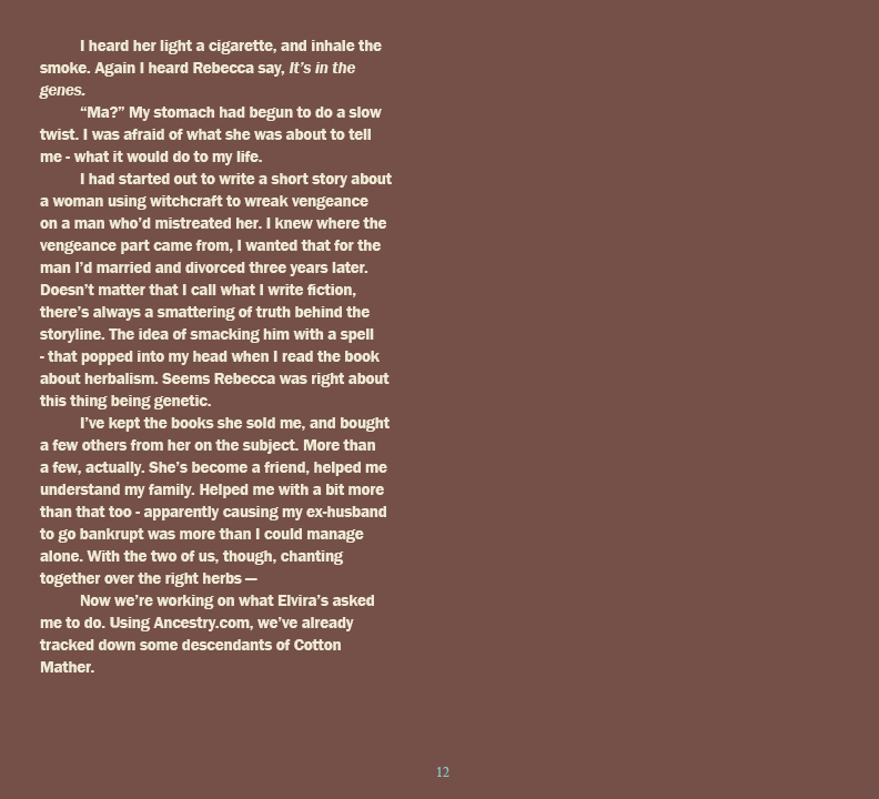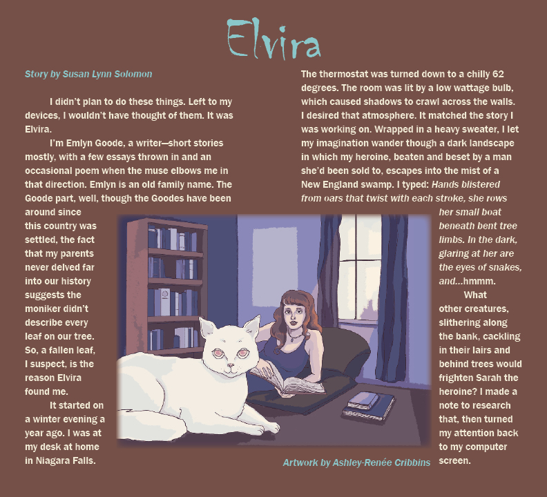 Susan Lynn Solomon lives and writes in Niagara Falls, NY. Her short stories, "Ginger Man," "The Memory Tree" and "Witches Gumbo" have appeared in prior issues of Imitation Fruit. Her story, "Abigail Bender, " was an honorable mention in a Writers' Journal short romance competition. Other stories have appeared in Prick of the Spindle, and Literary Juice, Sunstorm Fine Arts Magazine, and on the web in Our Echo. She wrote the text for a book containing the works of the artist, José Royo. Her essay, "Walking the Paper Trail, " has been quoted in court cases, and cited in law journal articles. An art major in high school and college, she began her creative career as a songwriter and performer with the 1960's band, Coconut Groove.