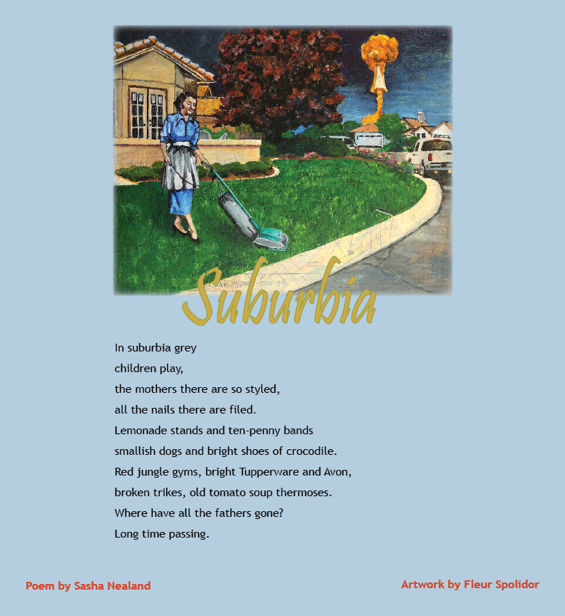 New York-based French artist Fleur Spolidor loves living abroad discovering new cultures. Born in Paris, she spent her childhood visiting castles and museums. After receiving her MFA, she taught art history and fine art at a university and in private design schools. In her "Alice" series of paintings, she mixes the story of Alice in Wonderland with the history of modern metropolises to represent the schizophrenic state of these ever-changing cities. Eco-conscious, Spolidor layers recycled and found materials in her work like papers, plastics and metals. In her painting "Atomic Suburbia," she represents a woman vacuuming artificial turf in front of her house with a nuclear mushroom in the background. Spolidor's palette is bold and colorful, while her subject matters raise awareness on worrisome issues like the never-ending fight for women's rights or climate change. See more of her work at artefleur.com