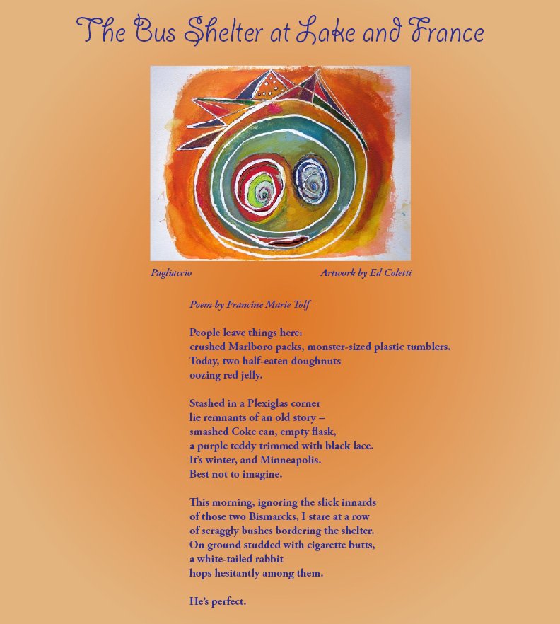 Most recently, his work has appeared online at Michael Rothenberg's great international art site Big Bridge. Ed Coletti is also a well-published poet. He can be reached at edcoletti@sbcglobal.net.